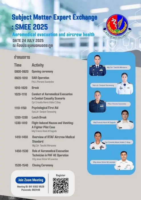 อนึ่ง การแลกเปลี่ยนความรู้และประสบการณ์เฉพาะด้าน (SMEE) ระหว่างแพทย์และพยาบาลเวชศาสตร์การบินของไทยและฟิลิปปินส์ มีการจัด ปีละ ๑ ครั้ง ปีนี้เป็นครั้งที่ ๒ ปีนี้กองทัพอากาศไทยเป็นเจ้าภาพ และในปีต่อไปทางฟิลิปปินส์ เสนอตัวเป็นเจ้าภาพ จะเชิญผู้แทนจากสถาบันเวชศาสตร์การบินกองทัพอากาศไปร่วมกิจกรรม SMEE ที่ประเทศฟิลิปปินส์