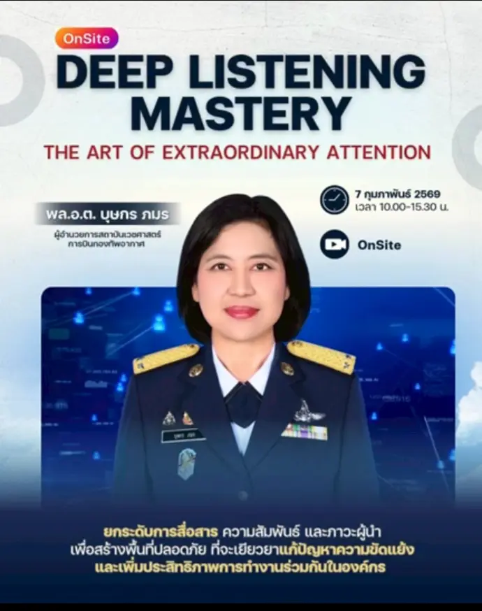 เมื่อวันศุกร์ที่ 7 กุมภาพันธ์ 2569 เวลา 10.00 – 15.30 น. พลอากาศตรีหญิง บุษกร ภมร ผู้อำนวยการสถาบันเวชศาสตร์การบินกองทัพอากาศ ได้รับเชิญให้เป็นวิทยากรถ่ายทอดองค์ความรู้และประสบการณ์ด้านการสื่อสารอย่างมีประสิทธิภาพ ผ่านแนวคิดการฟังเชิงลึก (Deep Listening) ซึ่งเป็นทักษะสำคัญในการสร้างความเข้าใจ ความไว้วางใจ และความร่วมมือภายในองค์กร
