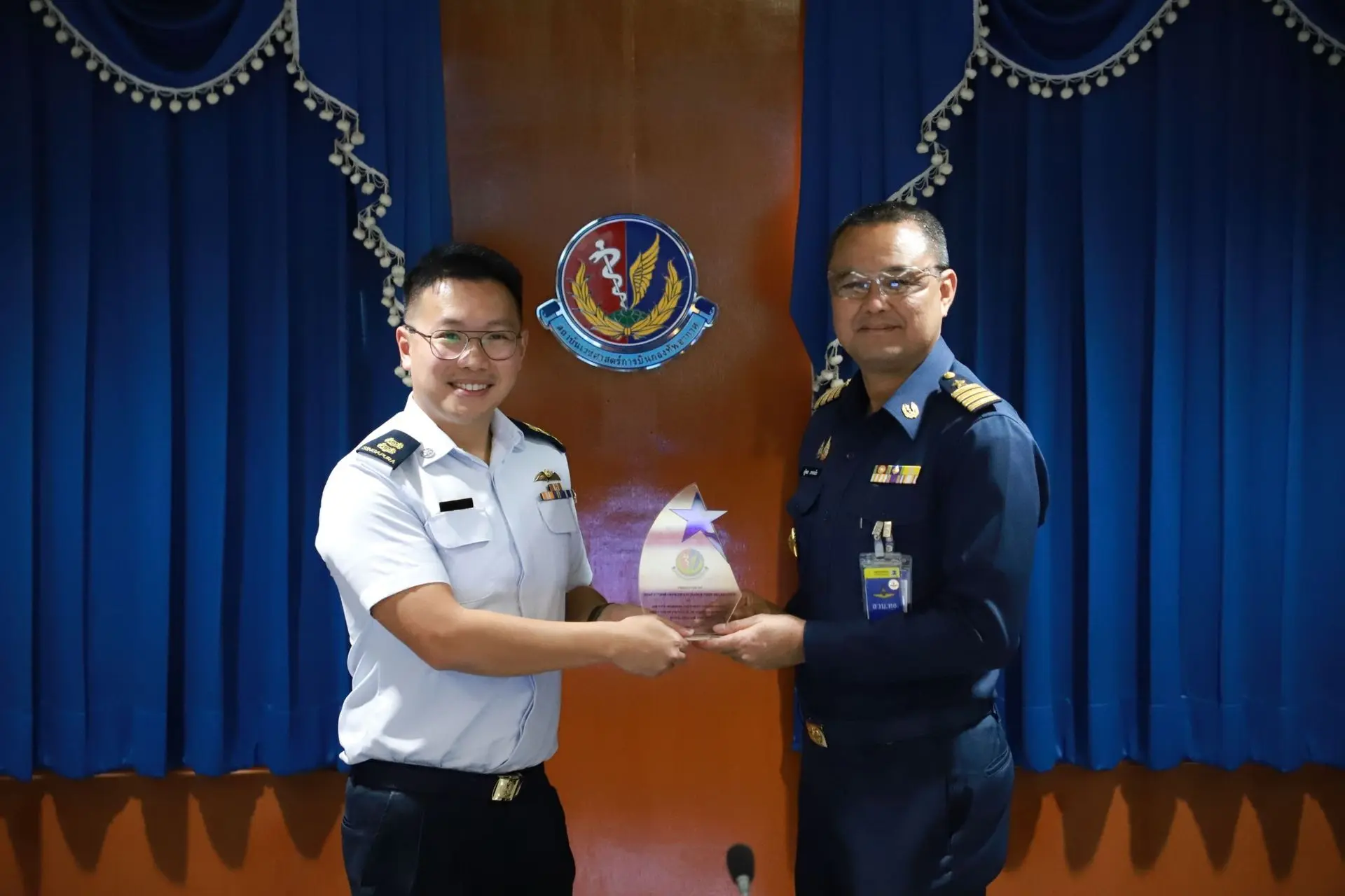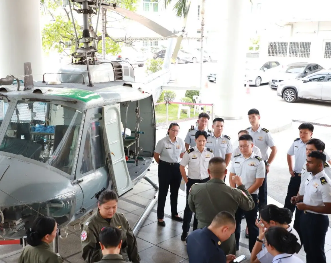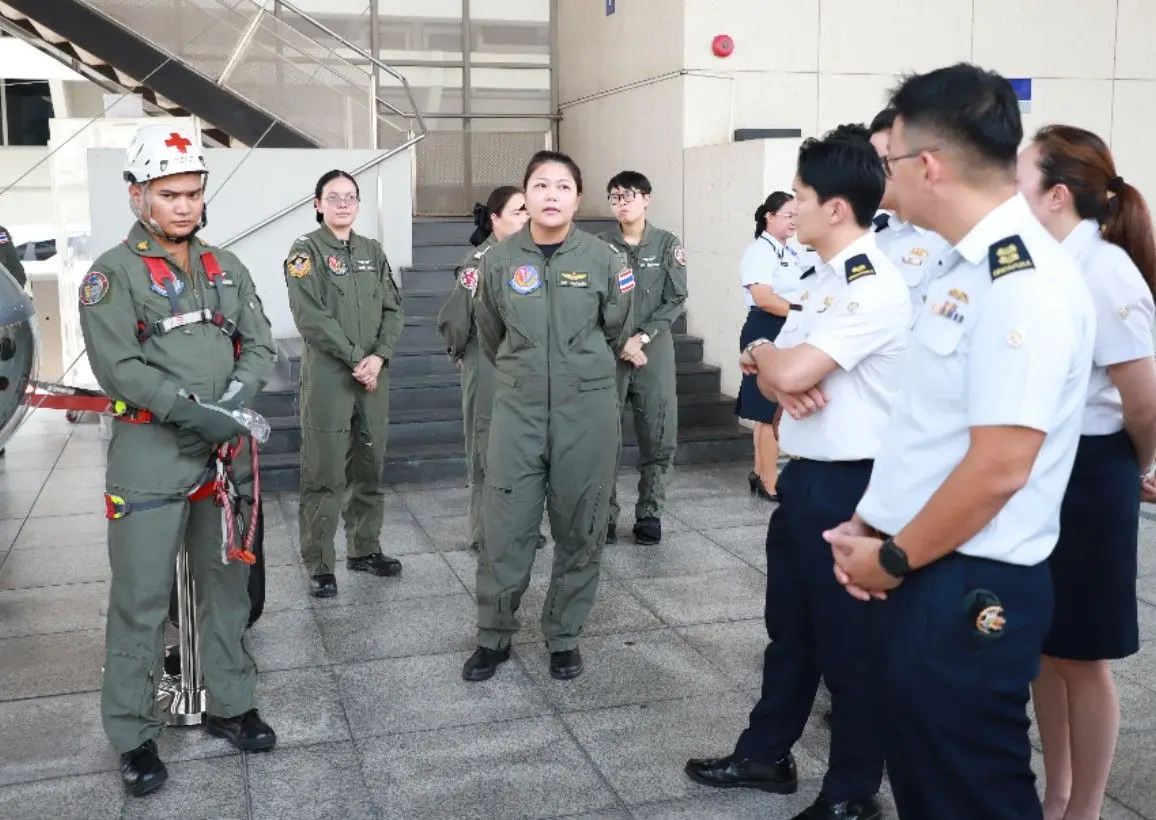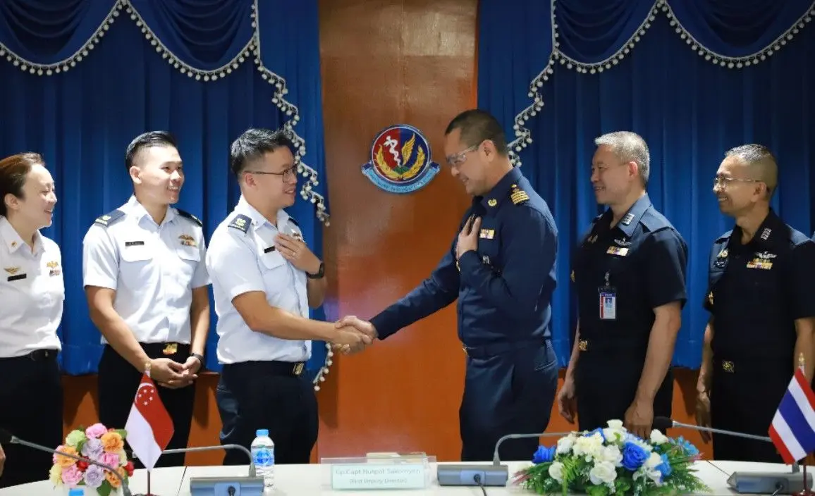 นาวาอากาศเอก นัฐพล สาครเย็น รองผู้อำนวยการสถาบันเวชศาสตร์การบินกองทัพอากาศ ให้การต้อนรับคณะผู้แทน ทอ.สิงคโปร์ จำนวน ๑๐ คน พร้อมทั้งฟังบรรยายสรุป เมื่อวันจันทร์ที่ ๒๐ เมษายน ๒๕๖๙ ณ ห้องประชุมหมอตระกูล สถาบันเวชศาสตร์การบินกองทัพอากาศ