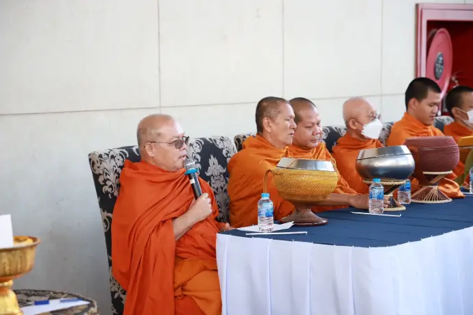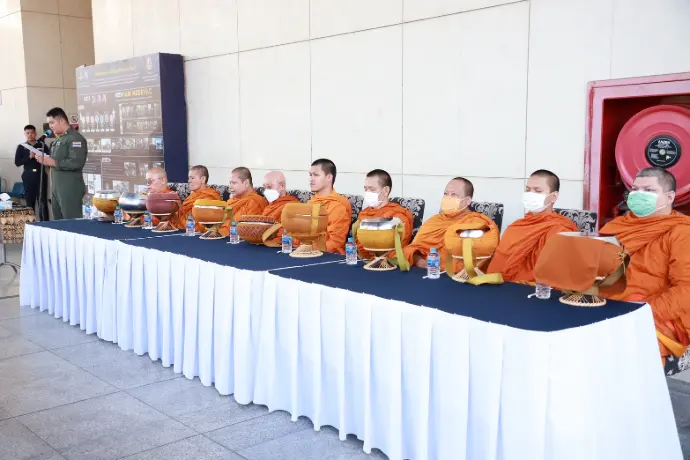 พระภิกษุสงฆ์ จำนวน ๙ รูป ณ บริเวณลานเฮลิคอปเตอร์ อาคารหมายเลข ๓ สถาบันเวชศาสตร์การบินกองทัพอากาศ พร้อมทั้งรับฟังธรรมเทศนาในหัวข้อเรื่อง