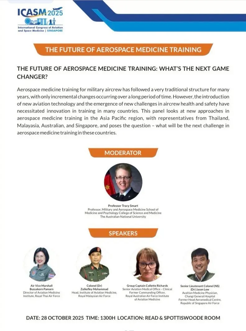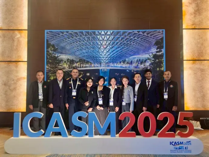 (The 71st International Congress of Aviation and Space Medicine, ICASM 2025) ซึ่งแนวคิดหลักในปีนี้เป็นหัวข้อ “Soaring Towards New Horizons in Aviation and Space Medicine” ระหว่างวันที่ ๒๗ – ๓๐ ตุลาคม ๒๕๖๘ ณ ประเทศสิงคโปร์ และร่วมบรรยายในหัวข้อ “Aerospace Medicine Training in Thailand and the Future Steps” และ “Development of a Competency Framework for Thai Aviation Medicine Instructor Physicians” ซึ่งได้รับความสนใจจาก